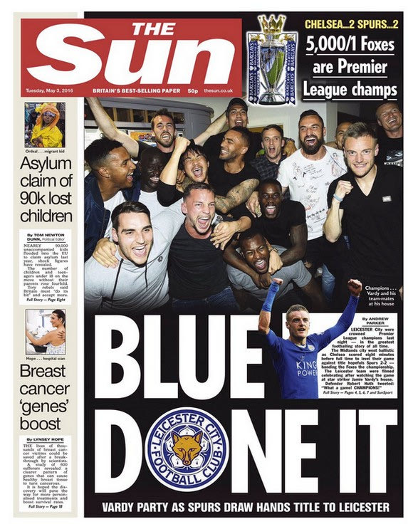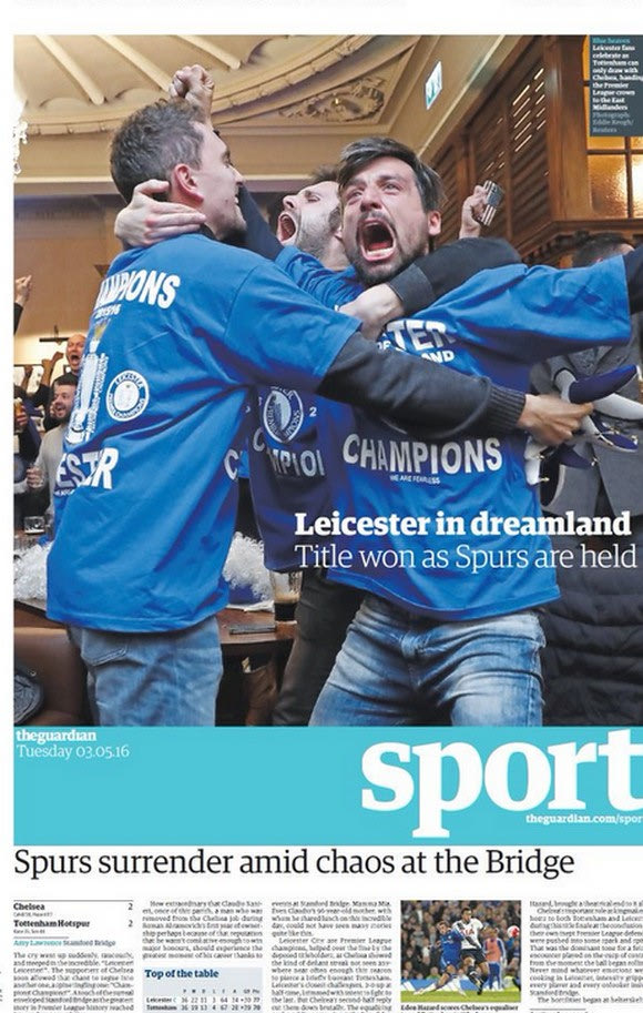 Ακούγεται απίστευτο αλλά είναι αλήθεια: η Λέστερ είναι πρωταθλήτρια Αγγλίας για τη σεζόν 2015-16. Δείτε πώς υποδέχτηκαν τα αγγλικά ΜΜΕ ένα από μεγαλύτερα ποδοσφαιρικά θαύματα όλων των εποχών.