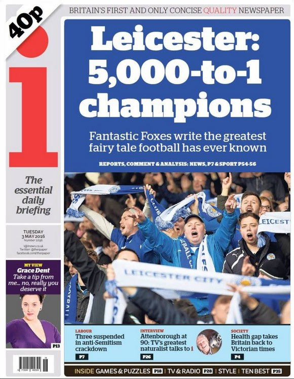 Independent ➔ Είχε απόδοση 5000/1 να πάρει πρωτάθλημα η Λέστερ. Οι φανταστικές αλεπούδες γράφουν το μεγαλύτερο ποδοσφαιρικό παραμύθι που έχει γραφτεί ποτέ