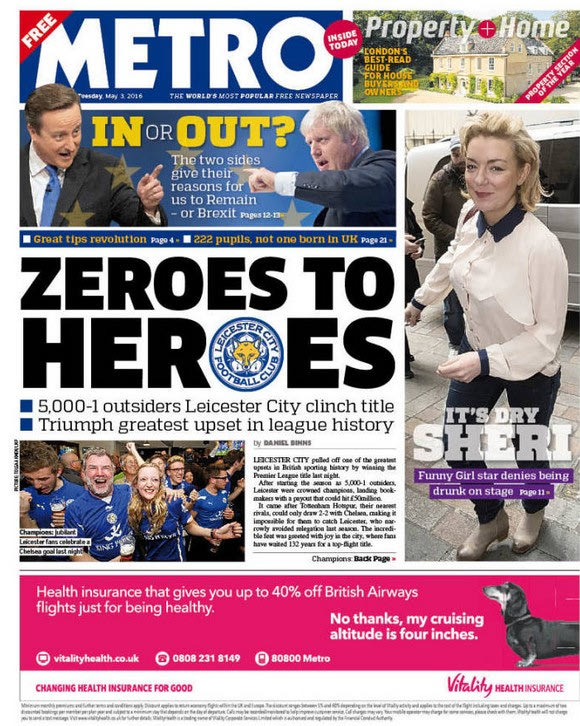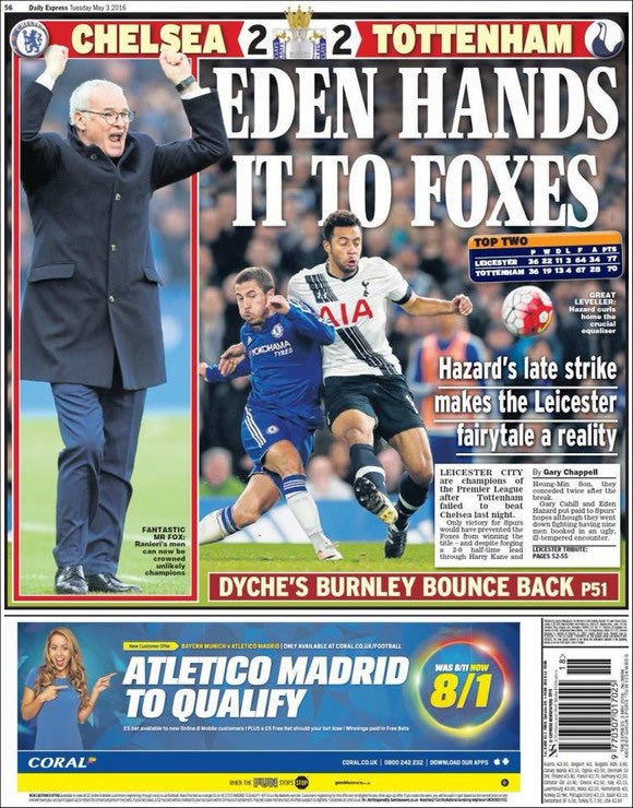 Πέρα πάντως από τη φρενίτιδα στους φίλους της, η ομάδα του Ρανιέρι κέρδισε και τον απόλυτο σεβασμό των αγγλικών ΜΜΕ, τα οποία αποθεώνουν τις “αλεπούδες” μέσω των σημερινών πρωτοσέλιδών τους.
