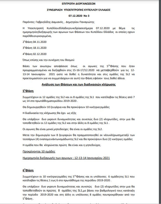 Συζητήθηκε διεξοδικά το θέμα της διεξαγωγής του Κυπέλλου Ελλάδος αγωνιστικής περιόδου 2020-21, μετά και τις πρόσφατες ανακοινώσεις της Πολιτείας για παράταση του lock down έως τις 7 Ιανουαρίου 2021. Η Επιτροπή Διοργανώσεων παρουσίασε στην Ε.Ε. δύο εναλλακτικά σχέδια για τη συνέχιση της διοργάνωσης, το πρώτο με συμμετοχή των ομάδων των Super League 1 και Super League 2 και το δεύτερο με συμμετοχή μόνον των ομάδων της Super League 1, τα οποία εγκρίθηκαν και θα υλοποιηθούν κατά περίπτωση, με βάση αφενός τη δυνατότητα συμμετοχής στη διοργάνωση των ομάδων της Super League 2, και αφετέρου τα μέτρα περιορισμού της πανδημίας που θα εφαρμοστούν την περίοδο των αγώνων.