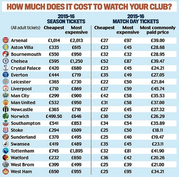 Δεν είναι υπερβολή να γραφτεί ότι κάποιος πρέπει να είναι πλούσιος για να παρακολουθήσει όλα τα εντός έδρας παιχνίδια της Άρσεναλ, αφού η πιο φτηνή θέση στο Emirates κοστίζει 1.014 λίρες (1.301 ευρώ), κόστος πιο ακριβό από τα ακριβά εισιτήρια των άλλων ομάδων!
