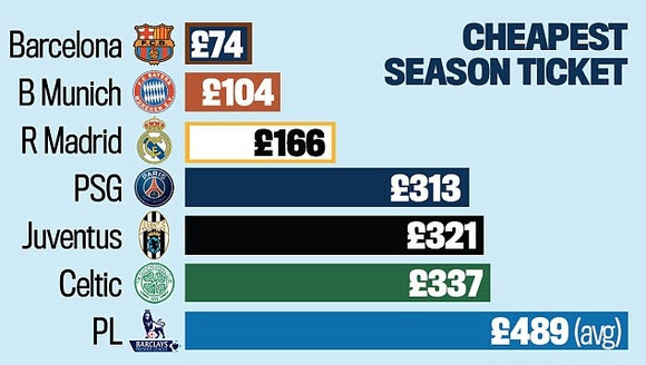 Την ίδια στιγμή, το κατά μέσο όρο φτηνότερο εισιτήριο διαρκείας στο Camp Nou κοστίζει 74 λίρες (94,99 ευρώ), στο Parc de Princes της Παρί Σεν Ζερμέν 313 λίρες (401,78 ευρώ) και στην Premier League, 489 λίρες (627,70 ευρώ)!