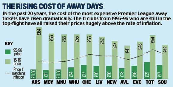 Η αύξηση των τιμών των εισιτηρίων την τελευταία 20ετία στην Premier League προκαλεί σοκ… Η Άρσεναλ κατέχει εκ νέου την πρώτη θέση της λίστας, αφού από τις 11,5 λίρες (14,76 ευρώ) που κόστιζε το πιο φτηνό εισιτήριο τη σεζόν 1995-1996, φέτος τιμάται προς 64 λίρες (82.15 ευρώ)… Δηλαδή, 5,5 φορές πιο υψηλό… Συγκριτικά, τη μικρότερη αύξηση παρουσίασε η Τότεναμ, που το εισιτήριο της κόστιζε το 1995-1996 προς 21 λίρες (26,96 ευρώ) – το πιο ακριβό τότε – και το αύξησε μόνο κατά 2,7 φορές, ήτοι 54 λίρες (69,32 ευρώ).