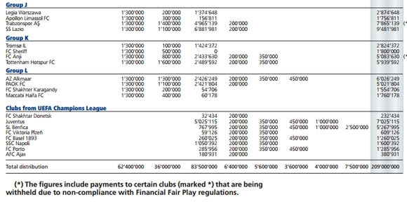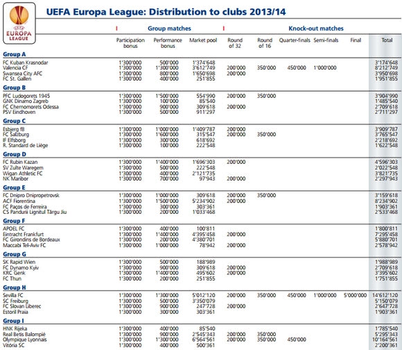 Τώρα στην άλλη διοργάνωση της UEFA (Γιουρόπα Λιγκ), ο ΠΑΟΚ έλαβε το ποσό των 5.021.804. Τέλος ο ΑΠΟΕΛ πήρε 1.800.811 εκ. ευρώ και ο Απόλλωνας Λεμεσού 1.756.811 εκ. ευρώ.