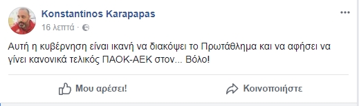 “Αυτή η κυβέρνηση είναι ικανή να διακόψει το Πρωτάθλημα και να αφήσει να γίνει κανονικά τελικός ΠΑΟΚ-ΑΕΚ στον… Βόλο!”.
