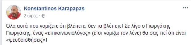 “Όλα αυτά που νομίζετε ότι βλέπετε, δεν τα βλέπετε! Σε λίγο ο Γιωργάκης Γιωργάκης, ένας «επικοινωνιολόγος» (έτσι νομίζω τον λένε) θα σας πεί ότι είναι «ψευδαισθήσεις»!”