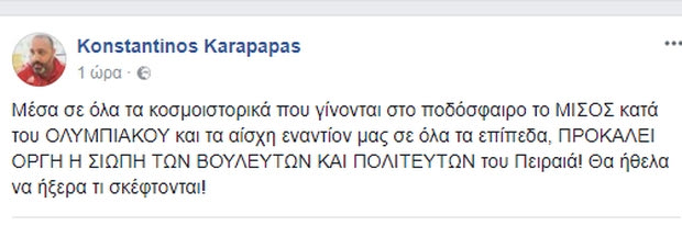 “Μέσα σε όλα τα κοσμοιστορικά που γίνονται στο ποδόσφαιρο το ΜΙΣΟΣ κατά του ΟΛΥΜΠΙΑΚΟΥ και τα αίσχη εναντίον μας σε όλα τα επίπεδα, ΠΡΟΚΑΛΕΙ ΟΡΓΗ Η ΣΙΩΠΗ ΤΩΝ ΒΟΥΛΕΥΤΩΝ ΚΑΙ ΠΟΛΙΤΕΥΤΩΝ του Πειραιά! Θα ήθελα να ήξερα τι σκέφτονται!”