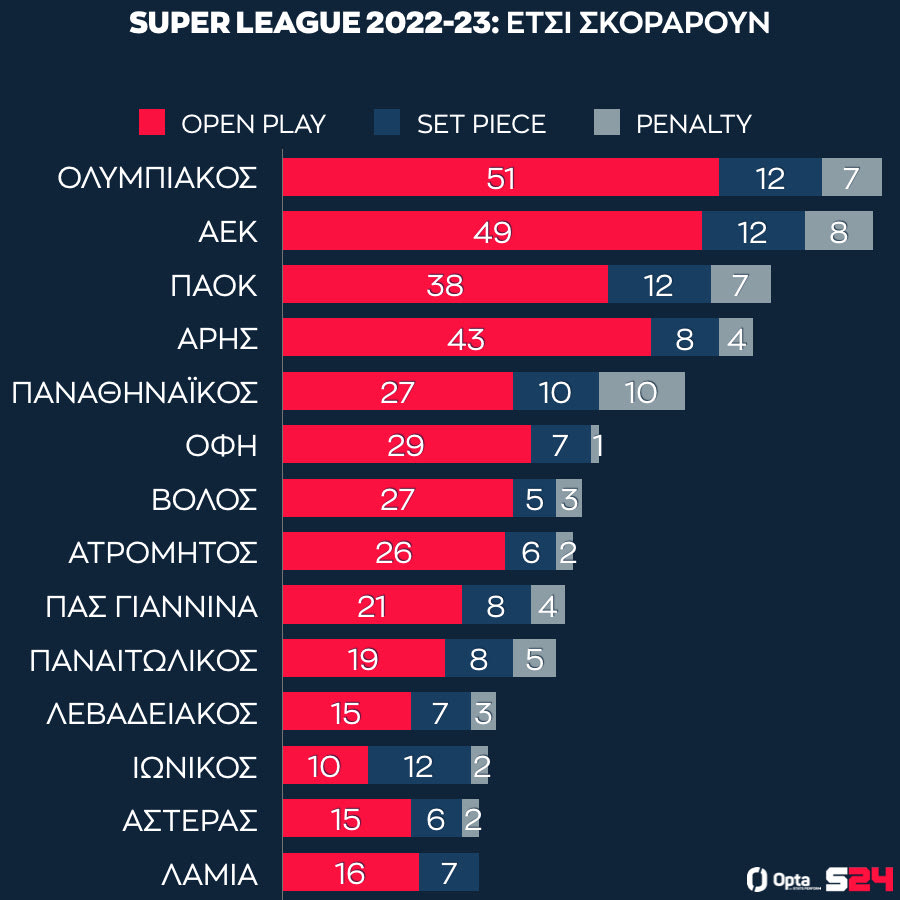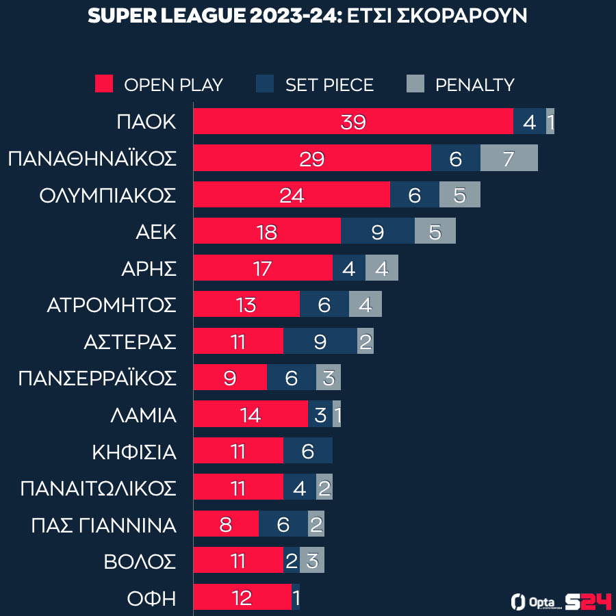 Ακόμα μεγαλύτερη δυσκολία είχε πέρυσι ο Παναθηναϊκός, αφού οι πράσινοι ολοκλήρωσαν το πρωτάθλημα με μόλις 27 γκολ στο open play. Θα ήταν εξαιρετικά δύσκολο για την ομάδα του Γιοβάνοβιτς να πάρουν τον τίτλο όταν υπήρχαν τρεις διεκδικητές με περισσότερα γκολ στο open play.