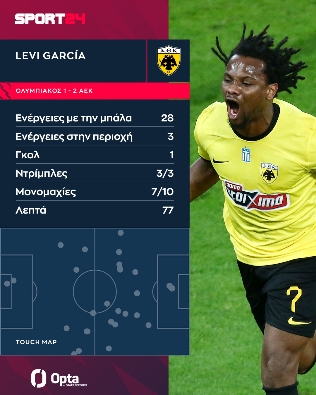 Μεγάλος πρωταγωνιστής ήταν ο Λιβάι Γκαρσία. Ο φορ της ΑΕΚ άνοιξε το σκορ, πήρε τη μονομαχία που έφερε το δεύτερο γκολ και βρήκε δίχτυα για 5ο σερί παιχνίδι πρωταθλήματος.