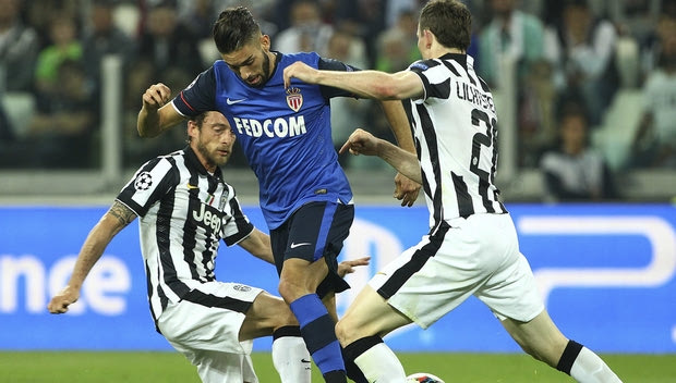 TURIN, ITALY - APRIL 14: Yannick Ferreira-Carrasco (C) of AS Monaco FC is challenged by Claudio Marchisio (L) and Stephan Lichtsteiner (R) of Juventus FC during the UEFA Champions League Quarter Final First Leg match between Juventus and AS Monaco FC at Juventus Arena on April 14, 2015 in Turin, Italy. (Photo by Marco Luzzani/Getty Images)