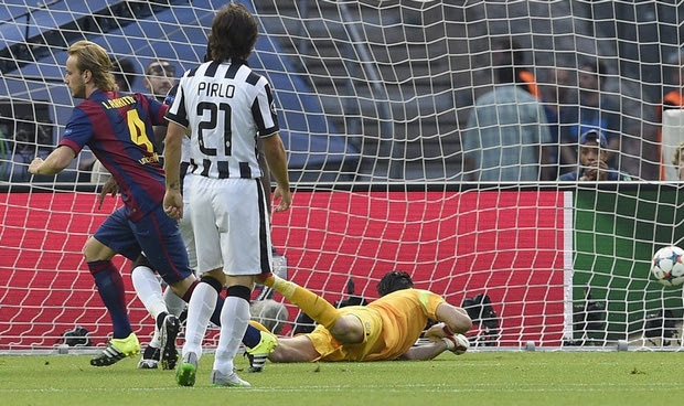 Barcelona's Croatian midfielder Ivan Rakitic (L) celebrates after scoring during the UEFA Champions League Final football match between Juventus and FC Barcelona at the Olympic Stadium in Berlin on June 6, 2015. AFP PHOTO / LLUIS GENE (Photo credit should read LLUIS GENE/AFP/Getty Images)