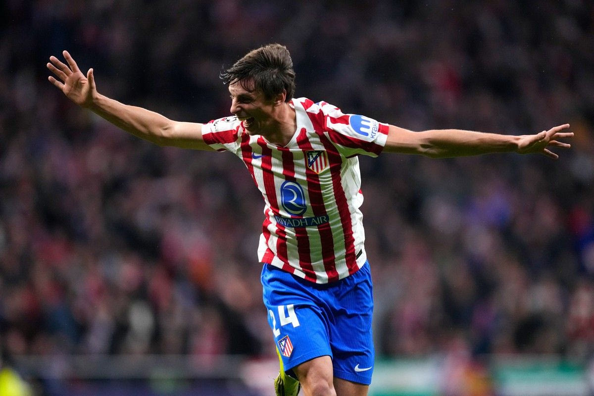 Atletico Madrid's Robin Le Normand celebrates after scoring his side's fourth goal during the first leg of the Champions League round of 16 soccer match between Atletico Madrid and Tottenham in Madrid, Spain, Tuesday, March 10, 2026. (AP Photo/Jose Breton)