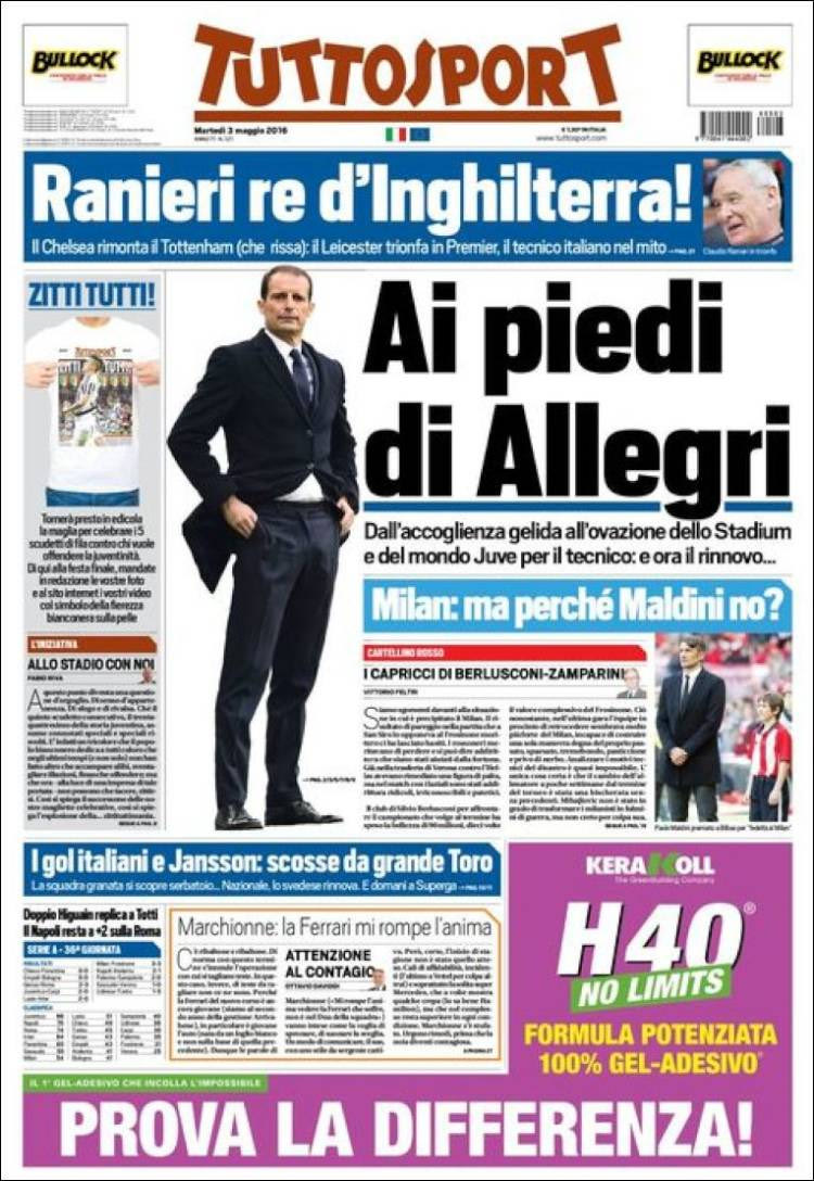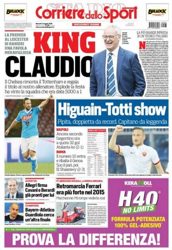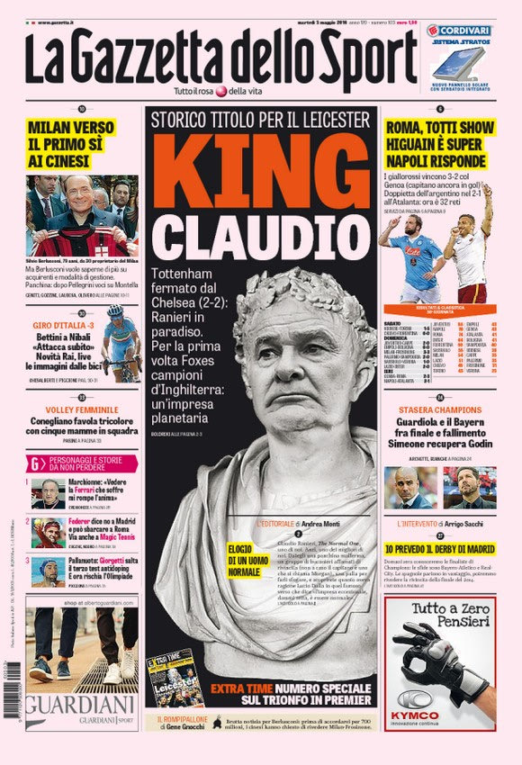 Τα πρωτοσέλιδα όλων τω μεγάλων αθλητικών εφημερίδων στη γειτονική χώρα έχουν σε πρώτο πλάνο τον Ρανιέρι, με την “Gazzetta dello Sport” να χρησιμοποιεί τη βοήθεια της τεχνολογίας για να τεκμηριώσει τον τίτλο της: “Βασιλιάς ο Ρανιέρι”.