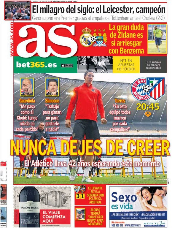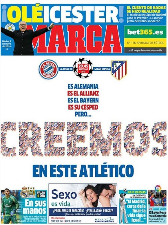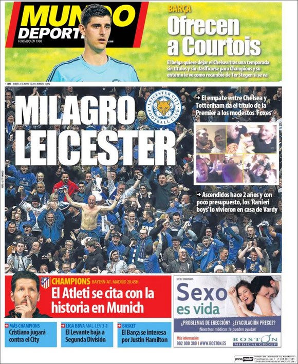 “Η Λέστερ πρωταθλήματα-Το θαύμα του αιώνα”, αναφέρει ο τίτλος της ισπανικής “As” την ώρα που η Marca κάνει λόγο για το παραμύθι που έγινε πραγματικότητα, με τους Ιταλούς από την πλευρά τους να στάζουν μέλι για τον συμπατριώτη τους.