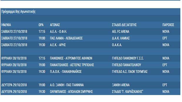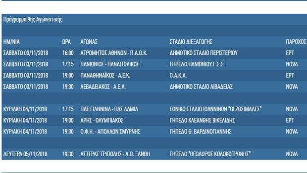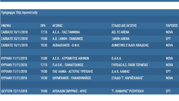 Για τη 10η αγωνιστική, την Κυριακή 11 Νοεμβρίου θα κοντραριστούν Ολυμπιακός και Παναθηναϊκός στις 19.30. Αναλυτικά: