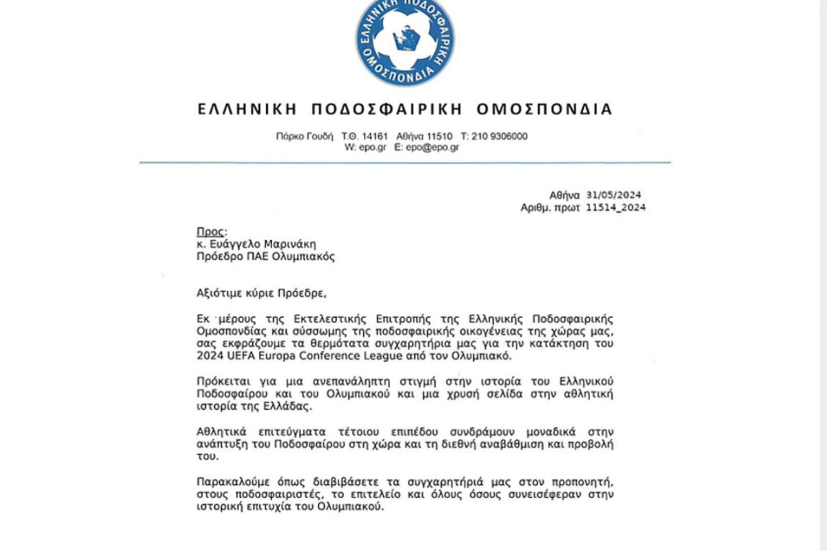 Εκ μέρους της Εκτελεστικής Επιτροπής της Ελληνικής Ποδοσφαιρικής Ομοσπονδίας και σύσσωμης της ποδοσφαιρικής οικογένειας της χώρας μας, σάς εκφράζουμε τα θερμότατα συγχαρητήριά μας για την κατάκτηση του 2024 UEFA Europa Conference League από τον Ολυμπιακό.