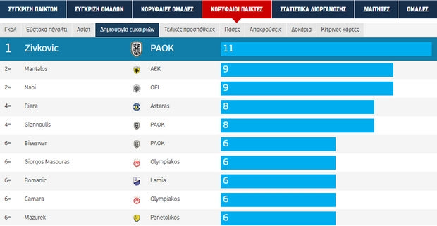 Επιλέγετε το Κορυφαίοι Παίκτες και έχετε τη δυνατότητα με ένα κλικ να δείτε τους πρώτους σε κάθε στατιστική κατηγορία. Γκολ, πέναλτι, ασίστ, δημιουργία ευκαιριών, τελικές προσπάθειες, πάσες, αποκρούσεις, δοκάρια και κίτρινες κάρτες.