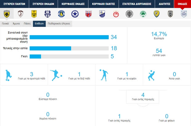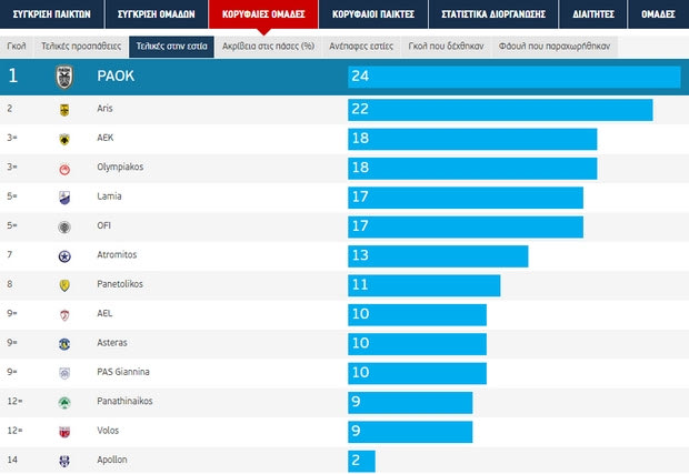 Με τον ίδιο τρόπο, μπορείτε να δείτε την κατάταξη των ομάδων στα γκολ, στις τελικές προσπάθειες, στις τελικές στην εστία, στο ποσοστό μεταβιβάσεων, στις ανέπαφες εστίες, στο παθητικό τερμάτων και στα φάουλ.