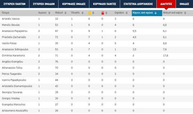 Όλες οι σφυρίχτρες της Super League, Έλληνες και ξένοι. Με ένα κλικ σε κάθε κατηγορία αλλάζει η κατάταξη του πίνακα και έτσι βλέπετε αμέσως ποιοι έχουν δώσει τα περισσότερα φάουλ ή πέναλτι, τις περισσότερες κόκκινες, τις περισσότερες κάρτες ανά αγώνα.