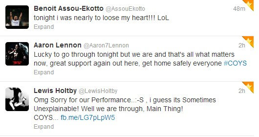 Όπως είναι λογικό, οι παίκτες της Τότεναμ, ίδρωσαν αρκετά να προκριθούν, ενάντια στους Ιταλούς κι αυτό δεν δίστασαν να το εκφράσουν και στους προσωπικούς τους λογαριασμούς στο twitter, λίγο μετά το τέλος του αγώνα.