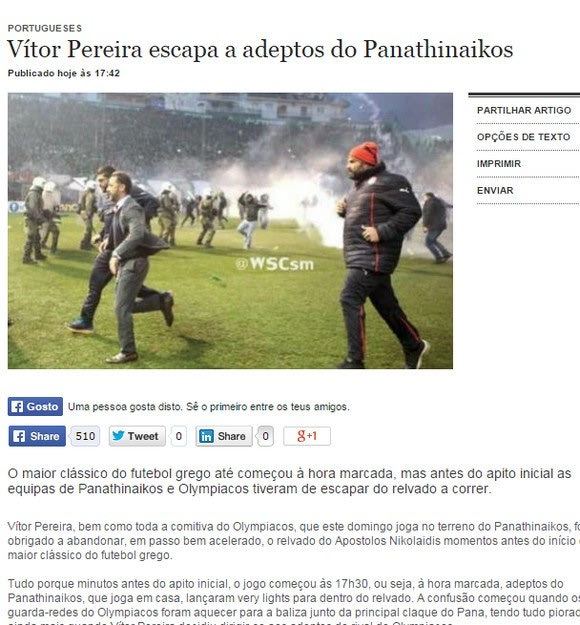 Η πορτογαλική “Ο jogo” εστιάζει στον τεχνικό του Ολυμπιακού, Βίτορ Περέιρα, ο οποίος “δραπέτευσε από τους οπαδούς του Παναθηναϊκού, καθώς υποχρεώθηκε να εγκαταλείψει τον αγωνιστικό χώρο”