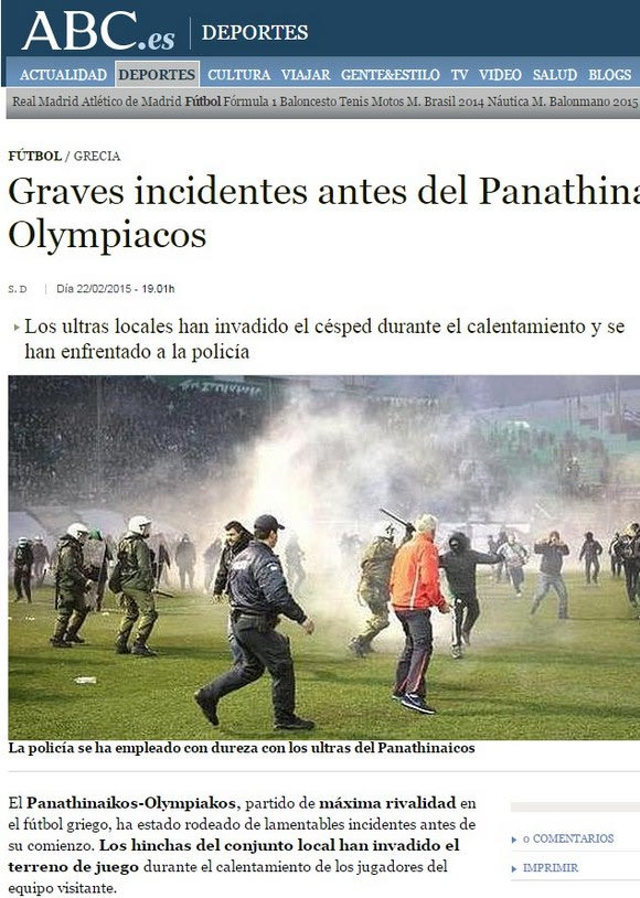 Ξανά στην Ιβηρική και την Ισπανία, η ABC γράφει: “Σοβαρά επεισόδια πριν το Παναθηναϊκός – Ολυμπιακός. Οι γηπεδούχοι ultras έχουν εισβάλει στο χορτάρι κατά τη διάρκεια της προθέρμανσης και αντιμετώπισαν στην αστυνομία. “
