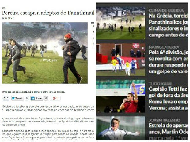 Το ESPN της Βραζιλίας κάνει λόγο για “μία θλιβερή σκηνή που συνέβη στην Αθήνα πριν το “κλάσικο” ανάμεσα σε Παναθηναϊκό και Ολυμπιακό, όταν κατά της προθέρμανσης οι οπαδοί των γηπεδούχων πέταξαν καπνογόνα στο γήπεδο, ακόμη και στον πάγκο”