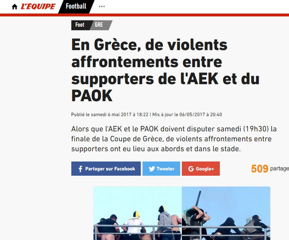 L’ Equipe (Γαλλία): “Βίαιες συγκρούσεις μεταξύ οπαδών της ΑΕΚ και του ΠΑΟΚ στην Ελλάδα”