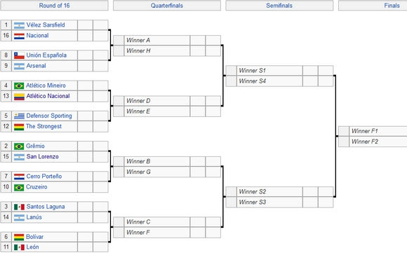 Τα ζευγάρια των “16” και οι διασταυρώσεις μέχρι τον τελικό…Τα αποτελέσματα της εβδομάδας:Τρίτη Βέλες Σάρσφιλντ – Ουνιβερσιτάριο 1-0 (52′ Ρομπέρτο Νάνι) Δε Στρόνγκεστ – Ατλέτικο Παραναένσε 2-1 (38′ αυτ. Μανοέλ, 55′ Νέλβιν Σολίς / 45′ Αντριάνο) Σέρο Πορτένιο – Ντεπορτίβο Κάλι 3-2 (37′ αυτ. Λουίς Μιγκέλ Παγιάρες, 45′ Ντάνι Γκουίθα, 80′ Χούλιο ντος Σάντος / 12′ Κριστιάν Μαρούγκο, 62′ Κάρλος Ρίβας) Ο’Χίγκινς – Λανούς 0-0 Τετάρτη Μπολίβαρ – Εμελέκ 2-1 (2′ Ουίλιαμ Φερέιρα, 51′ Χουάνμι Καγιεχόν / 88′ Λουίς Μιγκέλ Εσκαλάδα) Φλαμένγκο – Λεόν 2-3 (30′ Αντρέ Σάντος, 34′ Αλεκσάντρο / 21′ Φράνκο Αρισάλα, 31′ Μάουρο Μποσέλι, 84′ Κάρλος Πένια) Ουνιόν Εσπανιόλα – Ιντεπεντιέντε ντε Βάλε 4-5 (12′ και 59′ Ματίας Κάμπος, 66′ αυτ. Λουίς Λεόν, 73′ πέν. Γκουστάβο Κανάλες / 13′, 49′, 58′ και 76′ Ντανιέλ Ανγκούλο, 78′ πέν. Τζούνιορ Σορνόσα) Κρουζέιρο – Ρεάλ Γκαρσιλάσο 3-0 (24′ Ρικάρντο Γκουλάρτ, 27′ Μπρούνο Ροντρίγκο, 42′ Ζούλιο Μπαπτίστα) Σαν Λορένσο – Μποταφόγκο 3-0 (29′ Έκτορ Βιγιάλμπα, 54′ και 89′ Ιγνάσιο Πιάτι) Ντεφενσόρ – Ουνιβερσιδάδ ντε Τσίλε 1-1 (57′ Ματίας Αλόνσο / 39′ Ραμόν Φερνάντες) Πέμπτη Ατλέτικο Μινέιρο – Σαμόρα 1-0 (10′ Zo) Νασιονάλ Ασουνσιόν – Σάντα Φε 3-2 (38′ Χουλιάν Μπενίτες, 48′ Φρέντι Μπαρέιρο, 84′ Σίλβιο Τοράλες / 31′ και 82′ πέν. Βίλντερ Μεντίνα) Πενιαρόλ – Ντεπορτίβο Ανσοάτεγι 1-1 (Μπαλτάσαρ Σίλβα / 65′ Έντβιν Αγκιλάρ) Αρσενάλ Σαραντί – Σάντος Λαγκούνα 3-0 (21′ Εμίλιο Σελάγια, 54′ Μαριάνο Ετσεβερία, 74′ αυτ. Μαρκ Κρόσας) Νιούελς Ολντ Μπόις – Ατλέτικο Νασιονάλ 1-3 (17′ Μίλτον Κάσκο / 8′ Σαντιάγο Τρέγες, 14′ Σέρμαν Κάρντενας, 55′ Ορλάντο Μπερίο) Γκρέμιο – Νασιονάλ Μοντεβιδέο 1-0 (13′ πέν. Ερνάν Μπάρκος) Οι τελικές βαθμολογίες1ος όμιλος1. Βέλες Σάρσφιλντ (Αργεντινή) 15 (9-3) 2. Δε Στρόνγκεστ (Βολιβία) 10 (8-7) 3. Ατλέτικο Παραναένσε (Βραζιλία) 9 (7-7) 4. Ουνιβερσιτάριο (Περού) 1 (3-9) 2ος όμιλος1. Ουνιόν Εσπανιόλα (Χιλή) 9 (10-9) 2. Σαν Λορένσο (Αργεντινή) 8 (6-5) 3. Ιντεπεντιέντε ντε Βάλε (Εκουαδόρ) 8 (10-10) 4. Μποταφόγκο (Βραζιλία) 7 (5-7) 3ος όμιλος1. Σέρο Πορτένιο (Παραγουάη) 10 (10-9) 2. Λανούς (Αργεντινή) 8 (7-4) 3. Ντεπορτίβο Κάλι (Κολομβία) 7 (6-8) 4. Ο’Χίγκινς (Χιλή) 6 (5-5) 4ος όμιλος1. Ατλέτικο Μινέιρο (Βραζιλία) 12 (8-5) 2. Νασιονάλ Ασουνσιόν (Παραγουάη) 8 (8-10) 3. Σαμόρα (Βενεζουέλα) 7 (6-6) 4. Σάντα Φε (Κολομβία) 5 (10-11) 5ος όμιλος1. Ντεφενσόρ (Ουρουγουάη) 11 (11-5) 2. Κρουζέιρο (Βραζιλία) 10 (13-7) 3. Ουνιβερσιδάδ ντε Τσίλε (Χιλή) 10 (6-9) 4. Ρεάλ Γκαρσιλάσο (Περού) 3 (4-13) 6ος όμιλος1. Γκρέμιο (Βραζιλία) 14 (8-1) 2. Ατλέτικο Νασιονάλ (Κολομβία) 10 (7-8) 3. Νιούελς Ολντ Μπόις (Αργεντινή) 8 (10-7) 4. Νασιονάλ Μοντεβιδέο (Ουρουγουάη) 1 (4-12) 7ος όμιλος1. Μπολίβαρ (Βολιβία) 11 (8-6) 2. Λεόν (Μεξικό) 10 (10-7) 3. Φλαμένγκο (Βραζιλία) 7 (10-10) 4. Εμελέκ (Εκουαδόρ) 6 (7-12) 8ος όμιλος1. Σάντος Λαγκούνα (Μεξικό) 13 (11-5) 2. Αρσενάλ Σαραντί (Αργεντινή) 12 (11-4) 3. Πενιαρόλ (Ουρουγουάη) 5 (5-10) 4. Ντεπορτίβο Ανσοάτεγι (Βενεζουέλα) 3 (4-12) |