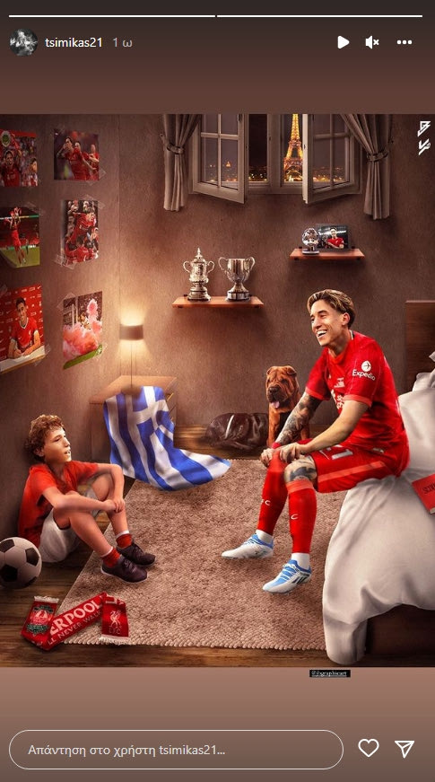 Ο Κώστας Τσίμικας ανέβασε μέσω ένα Insta story το οποίο απεικονίζει τον εαυτό του ως ποδοσφαιριστή της Λίβερπουλ και ως παιδί σε ένα δωμάτιο που βρίσκεται στο Παρίσι, ενόψει του τελικού του Champions League (28/05, 22:00 COSMOTE Sport 1, MEGA και LIVE SPORT24).