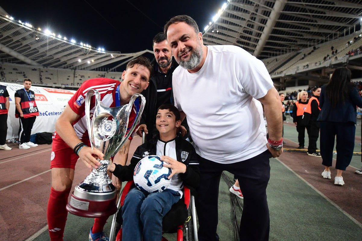 Στο φινάλε του τελικού του Κυπέλλου Ελλάδας Betsson εκτυλίχθηκε μία άκρως συγκινητική στιγμή στον αγωνιστικό χώρο του ΟΑΚΑ, με τον Βαγγέλη Μαρινάκη να καλεί τον αρχηγό της ομάδας Παναγιώτη Ρέτσο να δώσει το τρόπαιο στον μικρό Γιάννη για να το κρατήσει.