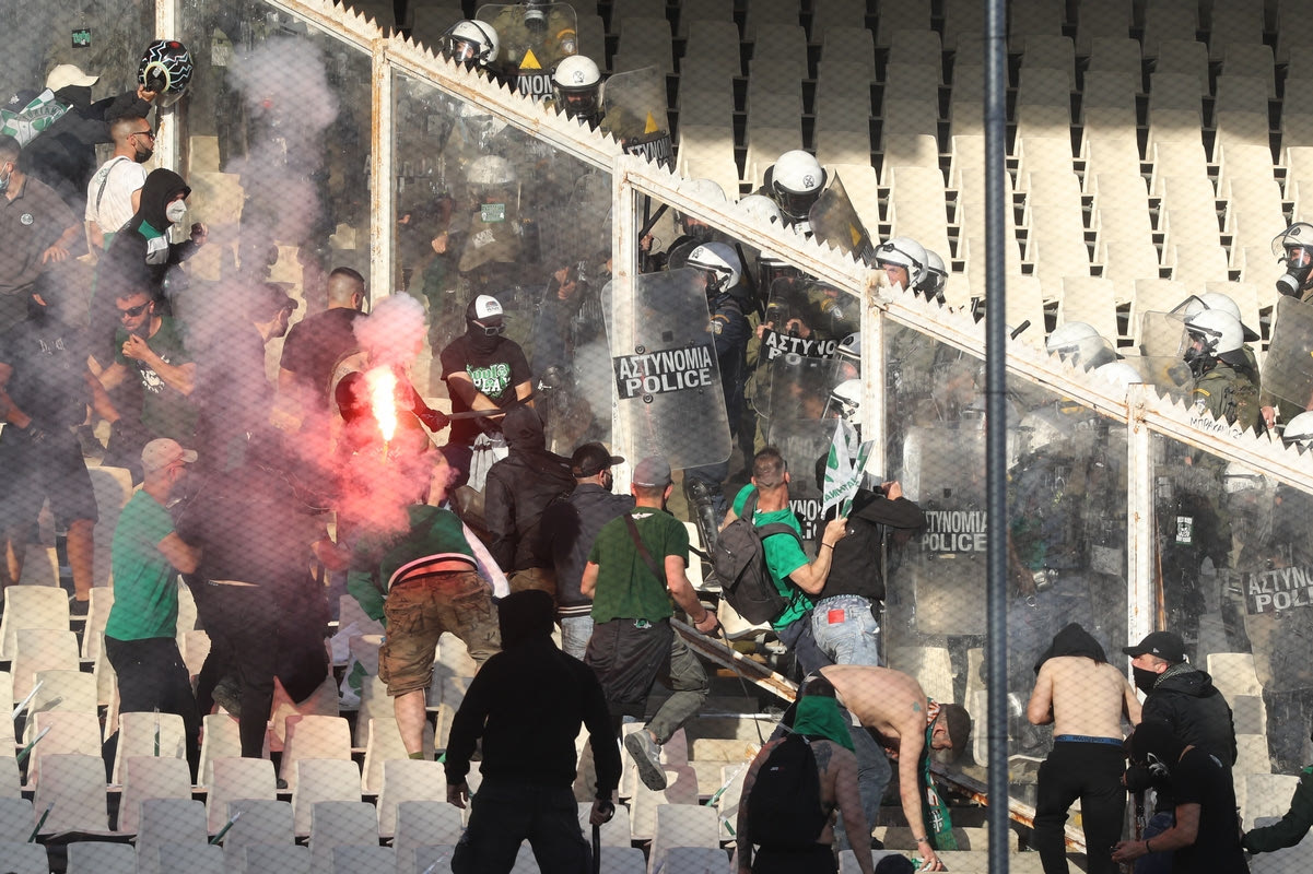 Η αστυνομία απάντησε με χειροβομβίδες κρότου λάμψης. Εκκλήσεις υπήρξαν από τα μεγάφωνα του ΟΑΚΑ προς τους οπαδούς και των δύο ομάδων, ώστε να επικρατήσει η ηρεμία. Οι αντεγκλήσεις συνεχίστηκαν, με τις αστυνομικές δυνάμεις να ενισχύονται.