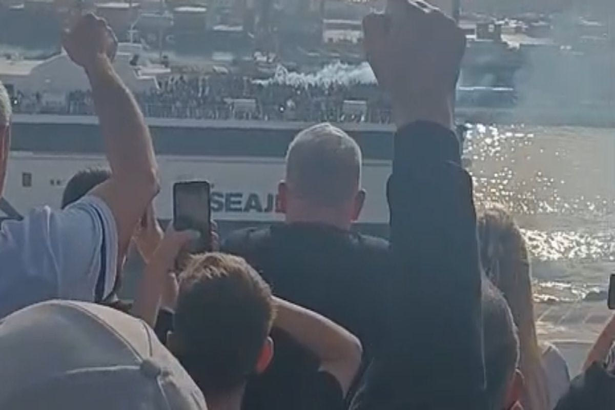 Οι φίλοι του ΟΦΗ έχουν δημιουργήσει ατμόσφαιρα… Γεντί Κουλέ στο πλοίο, ενώ είναι εντυπωσιακό πως τα δύο πλοία βρίσκονται το ένα απέναντι στο άλλο και η σκηνή μοιάζει με δύο πέταλα γηπέδου, όπου οι φίλαθλοι τραγουδούν συνθήματα.