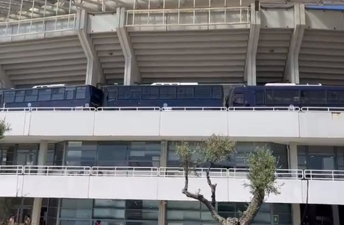 Οι κλούβες των ΜΑΤ στο πάνω διάζωμα των εξεδρών στο ΟΑΚΑ