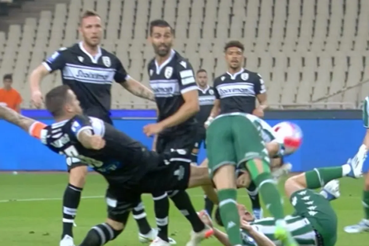 Ο Λαόθ στο 32ο λεπτό του τελικού Κυπέλλου Ελλάδας είδε φάση για χτύπημα του Βιεϊρίνια στον Γκατσίνοβιτς στο VAR και έδωσε πέναλτι υπέρ των πρασίνων.