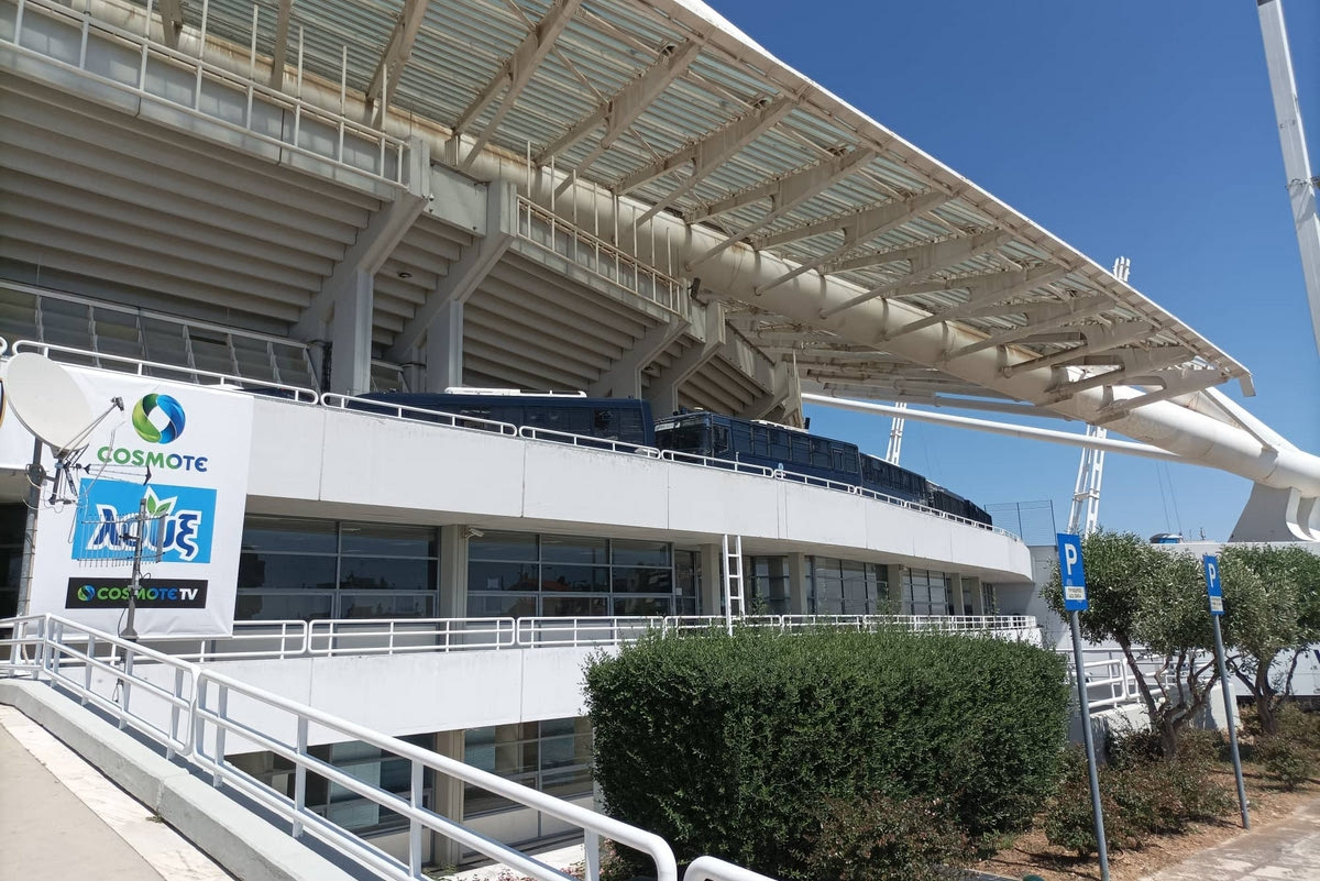 Ήδη βρίσκονται στο ΟΑΚΑ οι αύρες (τα οχήματα της αστυνομίας που ρίχνουν νερό), ενώ στο πάνω διάζωμα του ΟΑΚΑ, πάνω από τα δημοσιογραφικά ήδη βρίσκονται πολλές κλούβες που κόβουν τη διόδο και οποιαδήποτε προοπτική “επαφής’ των οπαδών δύο ομάδων.