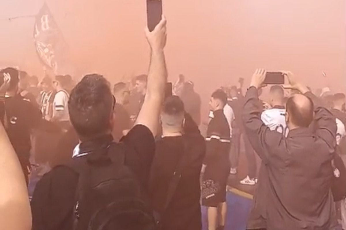 Οι ασπρόμαυροι τραγουδούν για την ομάδα τους ενώ έχουν ανάψει και καπνογόνο δίνοντας… ατμόσφαιρα Γεντί Κουλέ.
