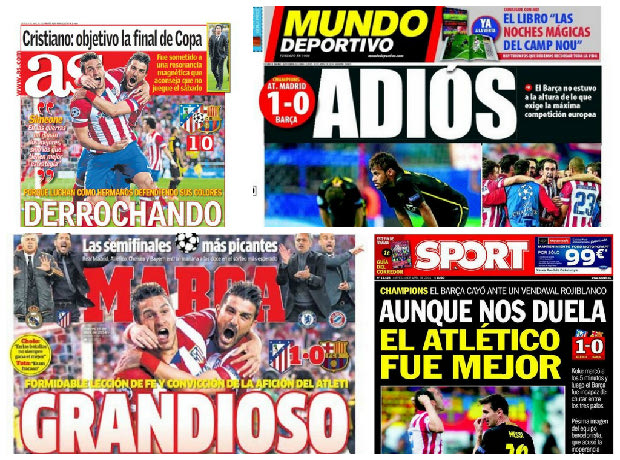 Στην Βαρκελώνη επικρατεί κατήφεια, προβληματισμός ενώ δεν λείπει και η αυτοκριτική για την πρώτη απουσία της Μπαρτσελόνα από τα ημιτελικά της κορυφαίας διασυλλογικής διοργάνωσης μετά από επτά χρόνια. Η πιο σκληροπυρηνική καταλανική εφημερίδα “Sport” αναγνωρίζει την ανωτερότητα της αντιπάλου με τίτλο: ” Αν και μας πονάει, η Ατλέτικο ήταν καλύτερη”.