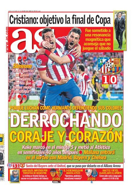 Η “As” διακρίνει τα “αποθέματα καρδιάς και κουράγιου από τους ποδοσφαιριστές της Ατλέτικο, που έπαιξαν σαν αδέρφια για να υπερασπιστούν την φανέλα της ομάδας τους”.