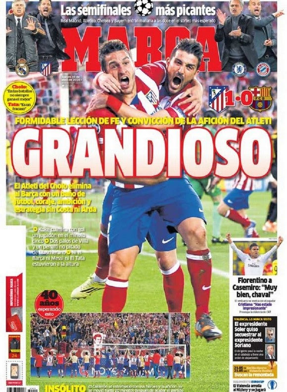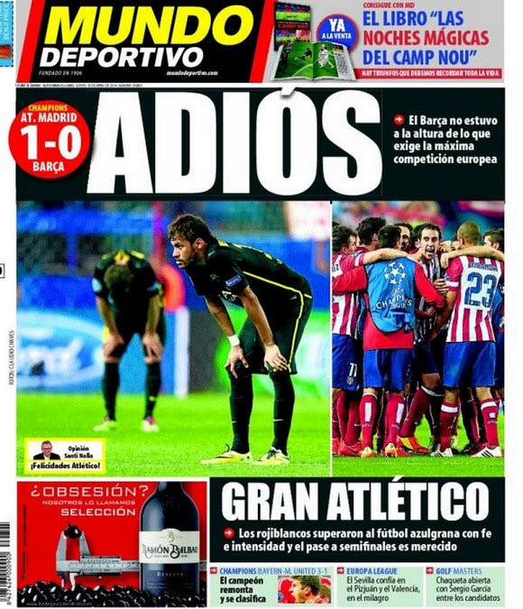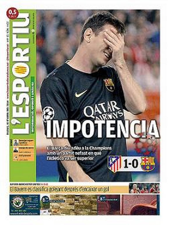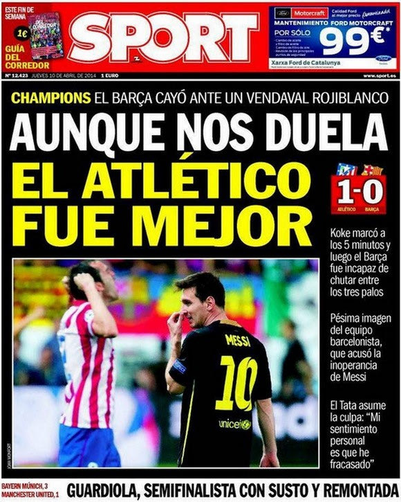 Στην Βαρκελώνη επικρατεί κατήφεια, προβληματισμός ενώ δεν λείπει και η αυτοκριτική για την πρώτη απουσία της Μπαρτσελόνα από τα ημιτελικά της κορυφαίας διασυλλογικής διοργάνωσης μετά από επτά χρόνια. Η πιο σκληροπυρηνική καταλανική εφημερίδα “Sport” αναγνωρίζει την ανωτερότητα της αντιπάλου με τίτλο: ” Αν και μας πονάει, η Ατλέτικο ήταν καλύτερη”.