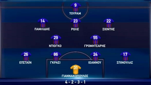 Τα δυο αμυντικά χαφ ήταν οι Γρομητσάρης και Κέβιν Ντιόγκο ενώ στην τριάδα μπροστά τους έπαιξαν από τα δεξιά προς τα αριστερά οι Σιόντης, Ρόλε και Παμλίδης ενώ στην κορυφή της επίθεσης ήταν ο Τουρέ.
