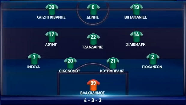 Στο 4-3-3 που χρησιμοποίησε ο Έλληνας τεχνικός είχε τον Βλαχοδήμο κάτω από τα γκολπόστ. Στο δεξί άκρο της άμυνας αγωνίστηκε ο Γιόχανσον και αριστερά ο Ινσούα ενώ το κεντρικό δίδυμο αποτελούσαν οι Οικονόμου, Κουρμπέλης. Στην τριάδα των χαφ το καθαρό εξάρι ήταν ο Τζανδάρης με τον Χίλιεμαρκ να παίζει στα δεξιά του και τον Λουντ στα αριστερά ενώ στην επίθεση στο δεξί άκρο έπαιζε ο Χατζηγιοβάνης, αριστερά ο Βιγιαφάνιες και στην κορυφή ο Δώνης.