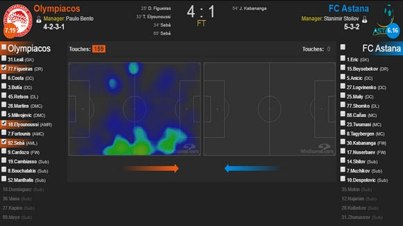 Φτάνοντας στο παιχνίδι με την Αστάνα, ο Βραζιλιάνος αποδείχθηκε κομβικός στην πορεία του Ολυμπιακού έως το 4-1. Και σούπερ αποτελεσματικός στην οικονομία του παιχνιδιού. Είχε 2 προσπάθειες στην εστία που κατέληξαν σε ισάριθμα γκολ και 90% ποσοστό ευστοχίας στις μεταβιβάσεις του!