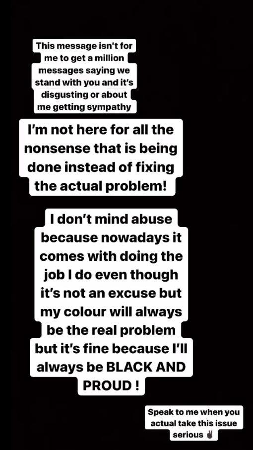 “Αυτό το μήνυμα δεν είναι για μένα, για να λαμβάνω ένα εκατομμύριο μηνύματα που να λένε “είμαστε δίπλα σου” και “είναι αηδιαστικό” ή για να εισπράττω συμπάθεια. Δεν είμαι εδώ για όλες τις ανοησίες που γίνονται αντί να διορθώσουμε το πραγματικό πρόβλημα.