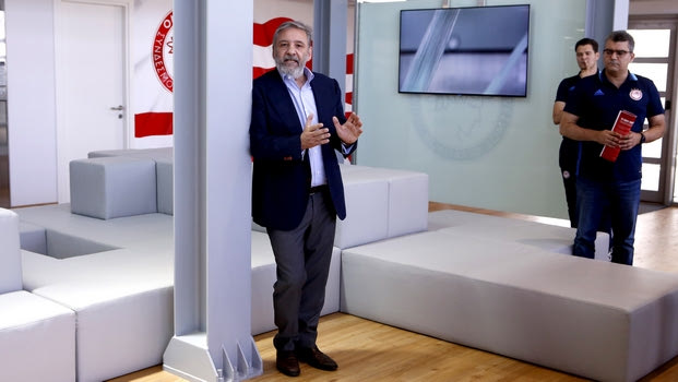 Το καλωσόρισμα έγινε στο σαλόνι των εγκαταστάσεων από τον Διευθύνοντα Σύμβουλο της ΠΑΕ Ολυμπιακός, Γιώργο Παύλου, του ανθρώπου που έχει παίξει σπουδαίο ρόλο τα τελευταία χρόνια στον τρόπο που έχει αναβαθμιστεί το Αθλητικό Κέντρο Ρέντη και ο τρόπος λειτουργίας της Ακαδημίας.