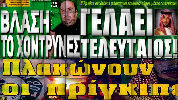 Υπέρ… πρίγκιπος η “Πράσινη” με τίτλο: “Γελάει τελευταίος”. Η αναφορά γίνεται στον Άραβα Σουλτάνο που “φέρεται να ετοιμάζει πληρωμένες απαντήσεις. Έως τη Δευτέρα η επίσημη δήλωση του”. Στο πρωτοσέλιδο άλλα χτυπήματα γράφουν ότι “Παίρνει θέση κι η πρεσβεία της Σ. Αραβίας”, ή ότι “Μέλη της οικογένειας του Αλ Σαούντ έρχονται να επενδύσουν κεφάλαια στην Ελλάδα”.