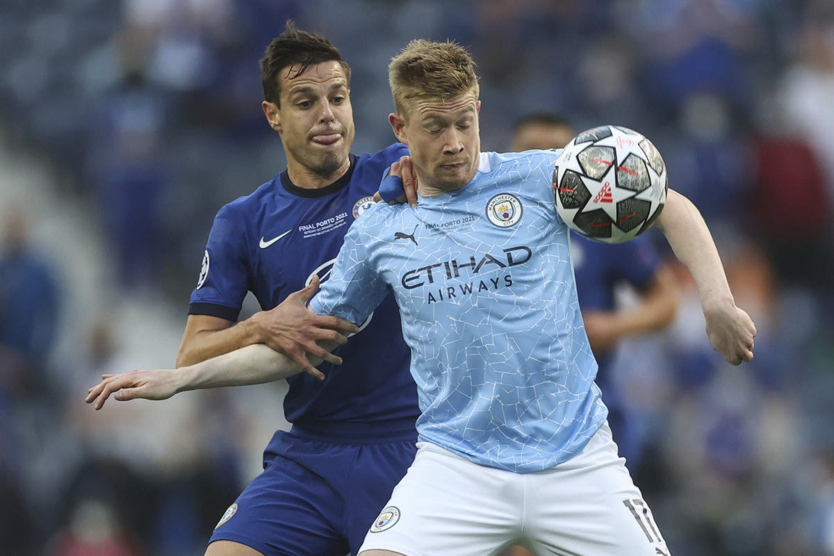 Ο Κέβιν Ντε Μπράινε διεκδικεί τη μπάλα μαζί με τον Θέσαρ Αθπιλικουέτα στον τελικό του Champions League μεταξύ της Μάντσεστερ Σίτι και της Τσέλσι (29 Μαΐου 2021)