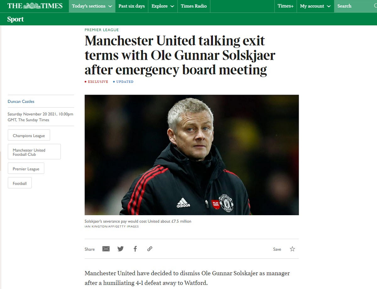 Οι Times υποστήριξαν σε βραδινό ρεπορτάζ ότι η διοίκηση της Μάντσεστερ Γιουνάιτεντ αποφάσισε να απολύσει τον Όλε Γκούναρ Σόλσκιερ, ύστερα από την έκτακτη τηλεδιάσκεψη με αφορμή τη συντριβή απ' τη Γουότφορντ.