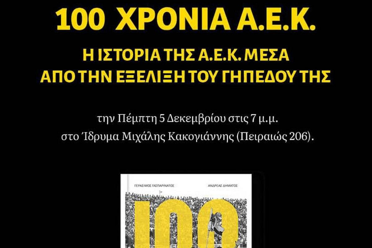 Την Πέμπτη 5 Δεκεμβρίου είναι προγραμματισμένη η παρουσίαση του βιβλίου “100 χρόνια Α.Ε.Κ. Η ιστορία της Α.Ε.Κ. μέσα από την εξέλιξη του γηπέδου της” των Γεράσιμου Γασπαρινάτου και Ανδρέα Δημάτου. Η παρουσίαση θα πραγματοποιηθεί στο Ίδρυμα Μιχάλης Κακογιάννης.