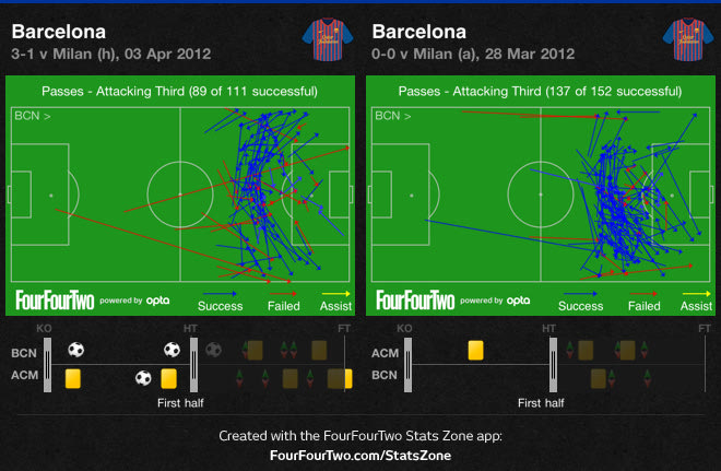 Όταν ο Φάμπρεγκας “βάθαινε” ο Μέσι δεν ήταν στα καλύτερα του: ήταν απομονωμένος και δυσκολευόταν να νικήσει τόσο τον Νέστα, όσο και τον Μεξές. Ο Φάμπρεγκας κι ο Μέσι ίσως ήταν καλύτερα να έμεναν πιο ψηλά κρατώντας το “τέσσερις εναντίον τεσσάρων” με την άμυνα της Μίλαν και να αφήσουν την αρχική κάθετη πάσα στον Τσάβι και στον Ινιέστα. Ο Γουαρδιόλα ήθελε να κυριαρχήσει στο παιχνίδι κατοχής και να μην μένει 3 εναντίον 4 στο κέντρο, αλλά το 61% κατοχής δεν είναι κάτι εξαιρετικό για τη Μπαρτσελόνα, ακόμη κι απέναντι σε μια ομάδα όπως η Μίλαν.